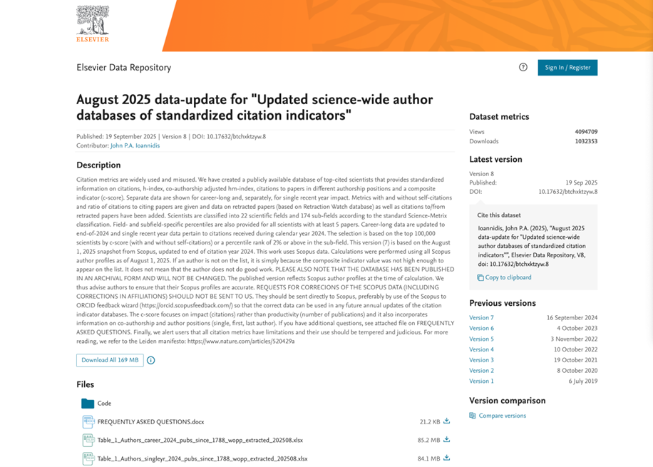 该榜单基于Scopus数据库的引用数据系统分析,以被引数(区分自引和他引,提供自引数据)、H-index、HM因子等6种综合指标 (composite score,C-score),根据 “生涯影响力”和“年度影响力”从近1000万名科学家中遴选出世界排名前2%的科学家,分为22个领域和174个子学科领域,为科学家长期科研表现提供了一个衡量指标,能够更客观、更真实地反映科学家的影响力。