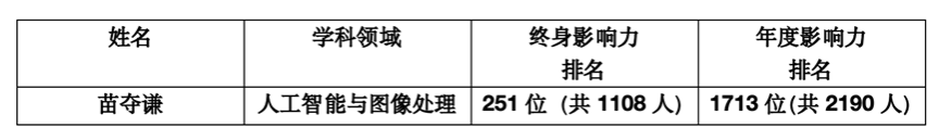 此次为苗夺谦教授连续第7次入选“终身科学影响力榜单”和“年度科学影响力榜单”。其高被引学科标签为“人工智能与图像处理”(Artificial Intelligence & Image Processing)。数据显示,其在1997-2024年间共发表411篇论文,h指数47,总被他引8133次。