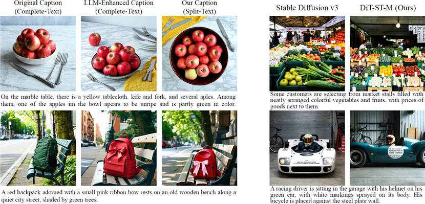论文提出了 DiT-ST(Split-Text Conditioning)框架,用于提升Diffusion Transform生成图像的语意质量。现有 DiT 通常采用一次性完整文本(complete-text)作为条件输入,面对包含对象、关系和属性等多种语义原语的复杂描述时,易出现属性错配、语义纠缠和细节遗漏等问题,DiT-ST 借助大语言模型将完整文本解析为对象、关系和属性等语义基元,并构建层级化的 Split-Text Conditioning,以降低文本结构复杂度并显式区分不同语义粒度。在扩散推理过程中,DiT-ST 依据不同去噪阶段对语义基元的敏感性差异,采用多阶段渐进式条件注入避免细粒度信息的过早暴露与语义竞争干扰整体生成。实验结果表明,DiT-ST 有效缓解了 DiT 的完整文本理解缺陷,在 GenEval 和 COCO-5K 等基准上显著提升了语义一致性与属性绑定能力,验证了Split-Text Conditioning与多阶段渐进式条件注入在Diffusion Transformer 中的有效性。