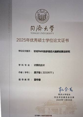 Under the supervision of Professor Duoqian Miao, two master students, Guangyin Bao and Zixuan Gong, have been awarded the 2025 Outstanding Master's Thesis Award at Tongji University. Both theses focus on brain visual decoding using functional magnetic resonance imaging (fMRI), a cutting-edge interdisciplinary field bridging neuroscience and artificial intelligence. Bao’s research explores multi-subject collaborative encoding and decoding models with privacy preservation, while Gong’s work advances multimodal decoding tasks including image retrieval and video reconstruction. Their innovative contributions have been published in top-tier conferences such as NeurIPS, ICLR, AAAI, and ACM MM. These achievements highlight the team's leading research capability in brain-inspired computing and neural decoding.