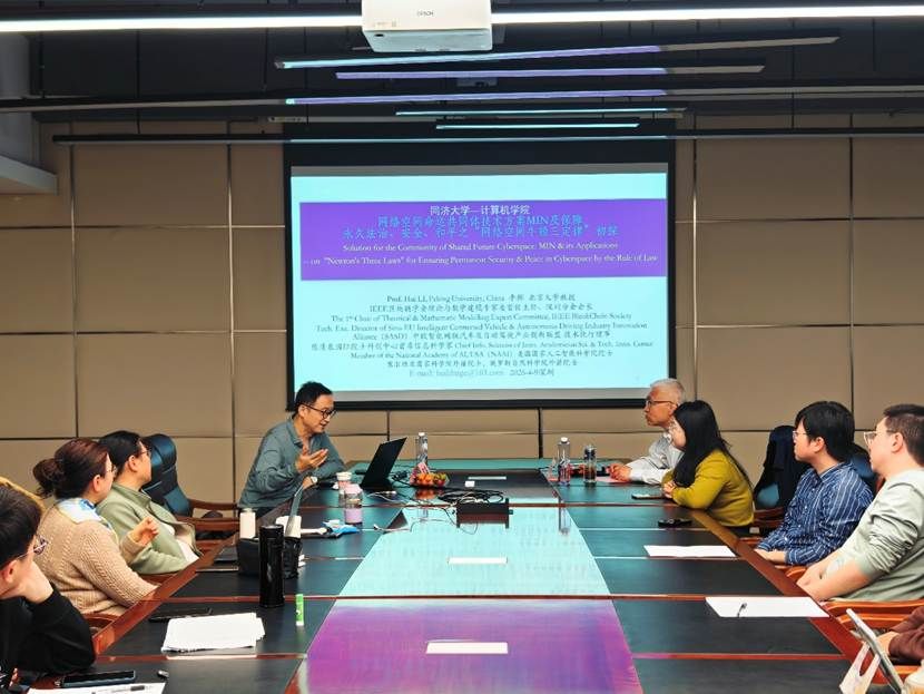 On April 9, 2026, invited by Professor Duoqian Miao, Professor Hui Li, Professor of Peking University, Foreign Academician of the Russian Academy of Natural Sciences, Fellow of the U.S. National Academy of Artificial Intelligence, and Honorary Dean of its Asian Research Institute, visited the laboratory and delivered an academic lecture titled: “Solution for the Community of Shared Future Cyberspace MIN & its Applications -- on The "Newton's Three Laws" for Ensuring Permanent Peace and Security in Cyberspace by the Rule of Law.”